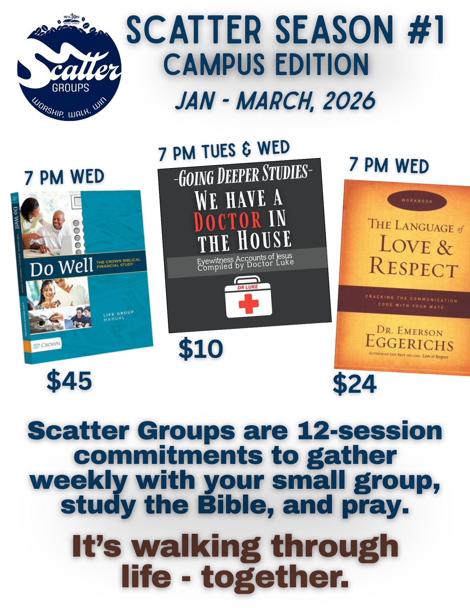 - Walk with Others in Bible study/prayer/friendship in a Scatter Group, weekdays (On Campus).